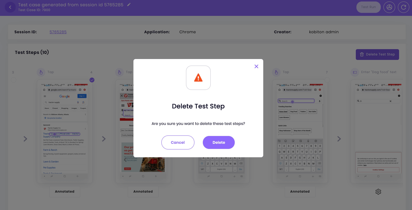 Manage test steps Learn how to manage the test steps, so you can improve your test case before running Scriptless Automation. Before you start You’ll need to create a test case from a baseline session. Open a test case In Sessions, search for a session, then select a session. Select Automation Test Case. Manage the test step Delete the test step You can delete one or more test steps at a time. Select the checkbox next to each test step you’d like to delete. When you’re ready, select Delete. Deleting a test step cannot be undone.