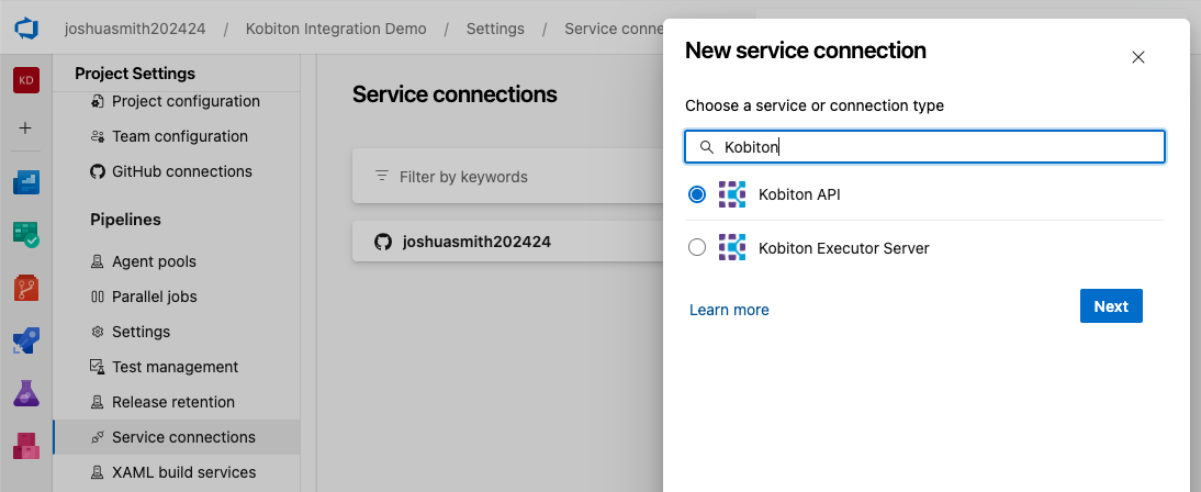 Configure environment variables in Azure DevOps Learn how to configure environment variables in Azure DevOps, so you and your team can upload apps and run automation tests. Before you start You’ll need to complete the following: Create an Azure DevOps pipeline. Upload a project to your cloud VCS. Optional: create a shared Kobiton account. Create service connections In Azure DevOps, open your project, then select Project settings. Under Pipelines, select Service connections, then Create a service connection. Search for Kobiton, then create connections for Kobiton API and Kobiton Executor Server. Kobiton API We recommend creating a shared Kobiton account for running automation tests instead of using your personal Kobiton API credentials. Enter the username and password for the shared Kobiton account, then select Verify and save. You can select Verify to verify the connection before saving. Kobiton Executor Server Change the Server Url to https://executor.kobiton.com. Enter the username and password for the shared Kobiton account, then select Verify and save. Update your test suite In the terminal, open your project. Example cd ~/my-project Open your test suite’s configuration file in a text editor. Example nano ./src/test/Config.java Add empty environment variables to the file using the following table. You’ll assign values later when you add Kobiton Automation Test Executor or Kobiton App Version Uploader to your pipeline. Environment Variable Required Description KOBITON_USERNAME Yes Your Kobiton username. KOBITON_API_KEY Yes Your Kobiton API key. KOBITON_SESSION_APPLICATION No Your app’s Kobiton App ID. KOBITON_DEVICE_NAME No A device’s name in Kobiton. KOBITON_SESSION_PLATFORM_VERSION No A device’s platform version. KOBITON_DEVICE_PLATFORM_NAME No A device’s platform version, either Android or iOS. Example (java) public class Config { enum SERVER_TYPE_ENUMS {KOBITON, LOCAL} private String kobitonServerUrl = "https://" + System.getenv("KOBITON_USERNAME") + ":" + System.getenv("KOBITON_API_KEY") + "@api.kobiton.com/wd/hub"; public void setCapabilities() { capabilities.setCapability("deviceGroup", "KOBITON"); capabilities.setCapability("deviceName", System.getenv("KOBITON_DEVICE_NAME")); capabilities.setCapability("platformName", System.getenv("KOBITON_DEVICE_PLATFORM_NAME")); capabilities.setCapability("platformVersion", System.getenv("KOBITON_SESSION_PLATFORM_VERSION")); capabilities.setCapability("app", System.getenv("KOBITON_SESSION_APPLICATION")); } public static final SERVER_TYPE_ENUMS SERVER_TYPE = SERVER_TYPE_ENUMS.KOBITON; public static final int IMPLICIT_WAIT_IN_SECOND = 30; public static final int DEVICE_WAITING_MAX_TRY_TIMES = 5; public static final int DEVICE_WAITING_INTERVAL_IN_MS = 30000; } When you’re finished, save your changes.